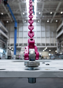 Ein Schwerpunkt der Messepräsentation ist der Anschlagpunkt ACP-Turnado (Bild oben) zum Drehen und Wenden von Lasten. Er verfügt über eine intelligente Federmechanik, die ein senkrechtes Stehenbleiben des Bügels bei Querbelastung verhindert. Der Bügel richtet sich stattdessen automatisch in Zugrichtung aus, sodass ein plötzliches Absacken der Last (Shock Load) vermieden wird. Der ACP-Turnado ist in den Größen M8 bis M100 erhältlich und deckt Traglasten von 0,7 bis 32,5 Tonnen ab.